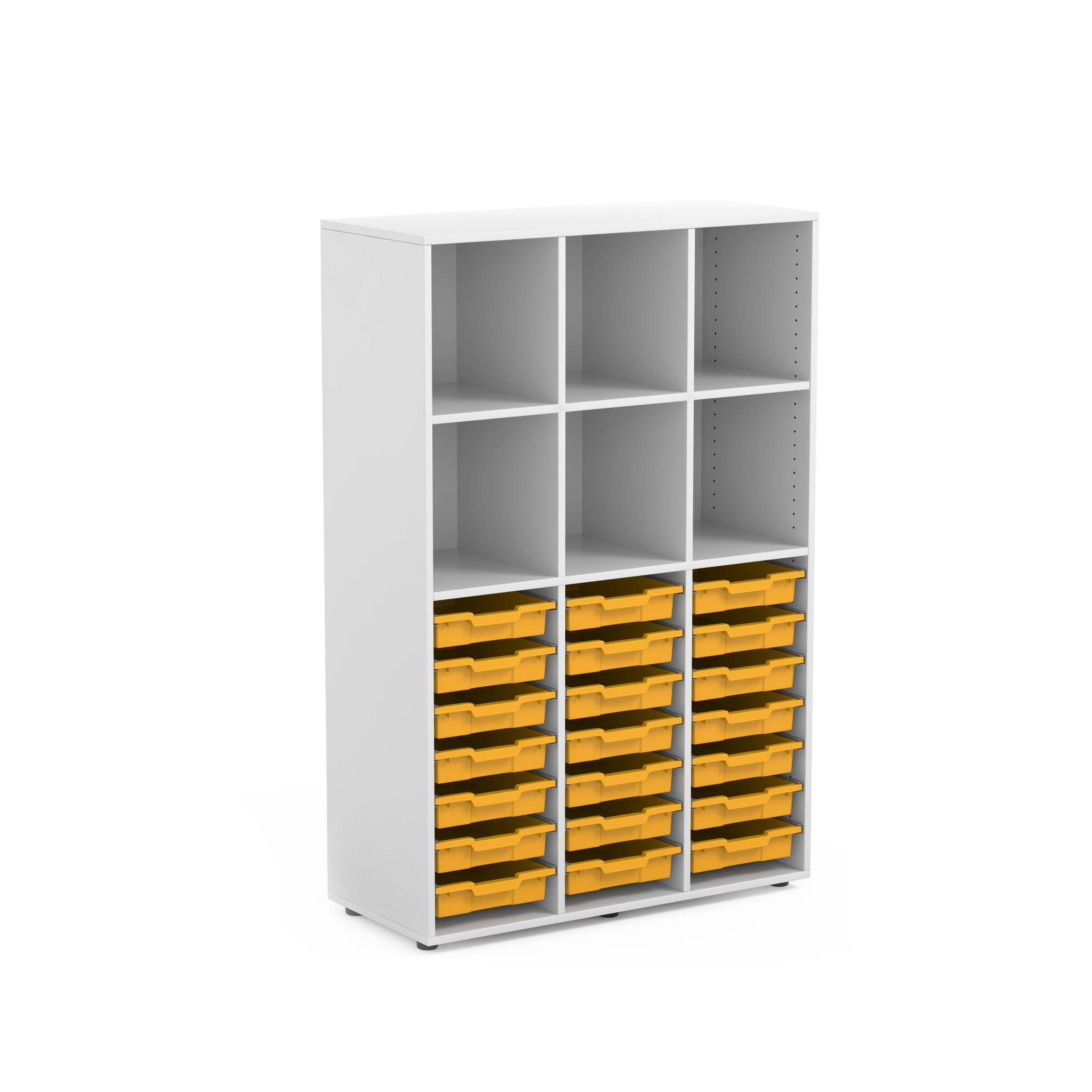 School cupboard with 6 interior spaces and capacity for 21 trays. Ideal for equipping cooperative learning classes.