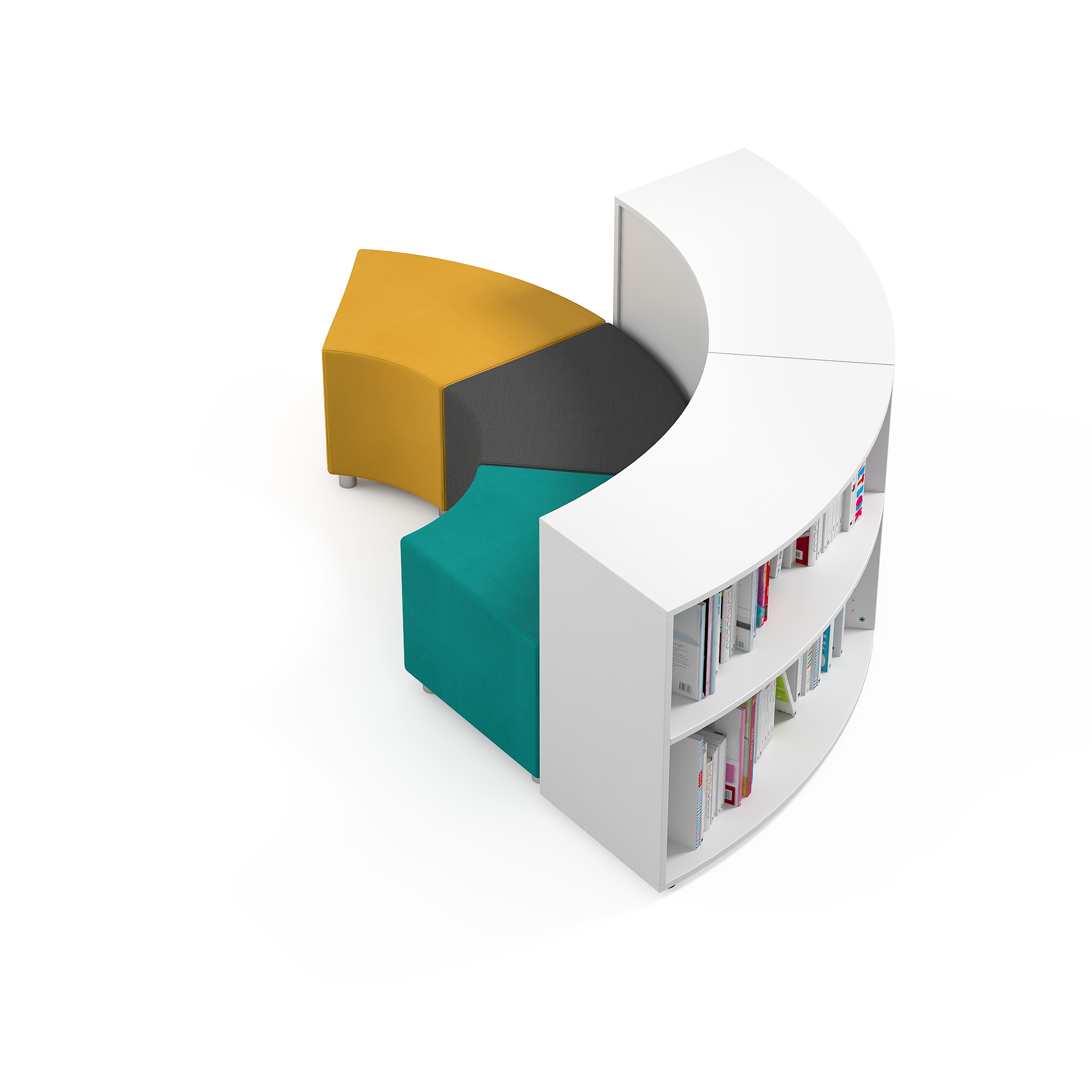 Open and curved school cupboard with two spaces and industrial wheels. Cabinet that allows to create new environments and different educational areas. Ideal for equipping cooperative learning classes.
